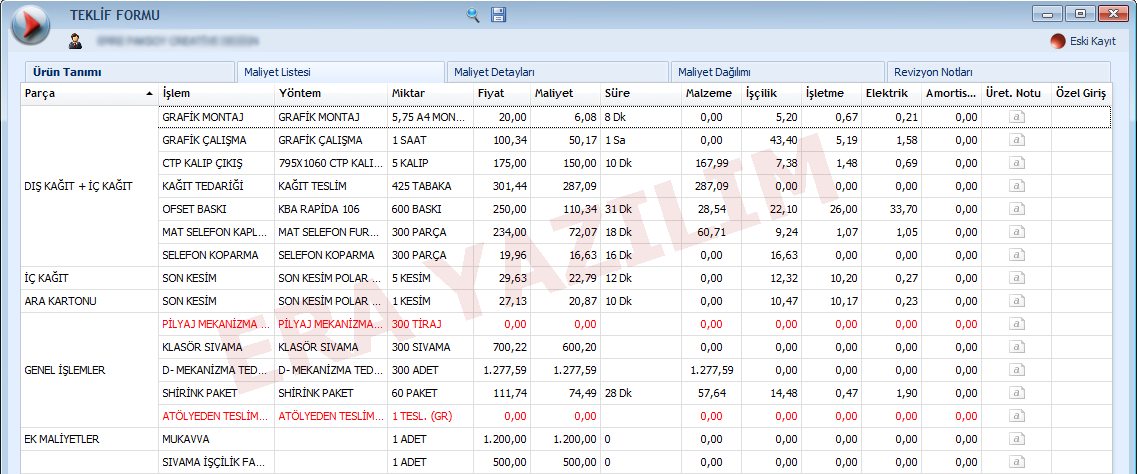 Aynı veya benzer işler şablon olarak kullanılabilirMüşterinin üretilmesini istediği bir ürünün bilgileri (ebad,renk,kağıt,mücellit işlemleri ve laminasyon vb.) girilerek ürünün maliyeti belirlenir. Müşterinin istediği ürüne ait bu bilgiler girilirken istenirse daha önceden bu müşteriye yapılmış aynı işler kopyalanarak anında yeni bir teklif oluşturulabilir. Bu müşteriye istediği üründen daha önce hiç üretilmemiş ise çok şey kaybetmiş olmazsınız. Diğer müşterilere benzer üründen üretilmiş olabilir ! Bu şablonu tek tuş ile kopyalayarak müşterinize teklif haline getirebilirsiniz. Miktar veya özellikler üzerinde yaptığınız düzeltmeler anında otomatik hesaplanarak maliyete yansıtılır.