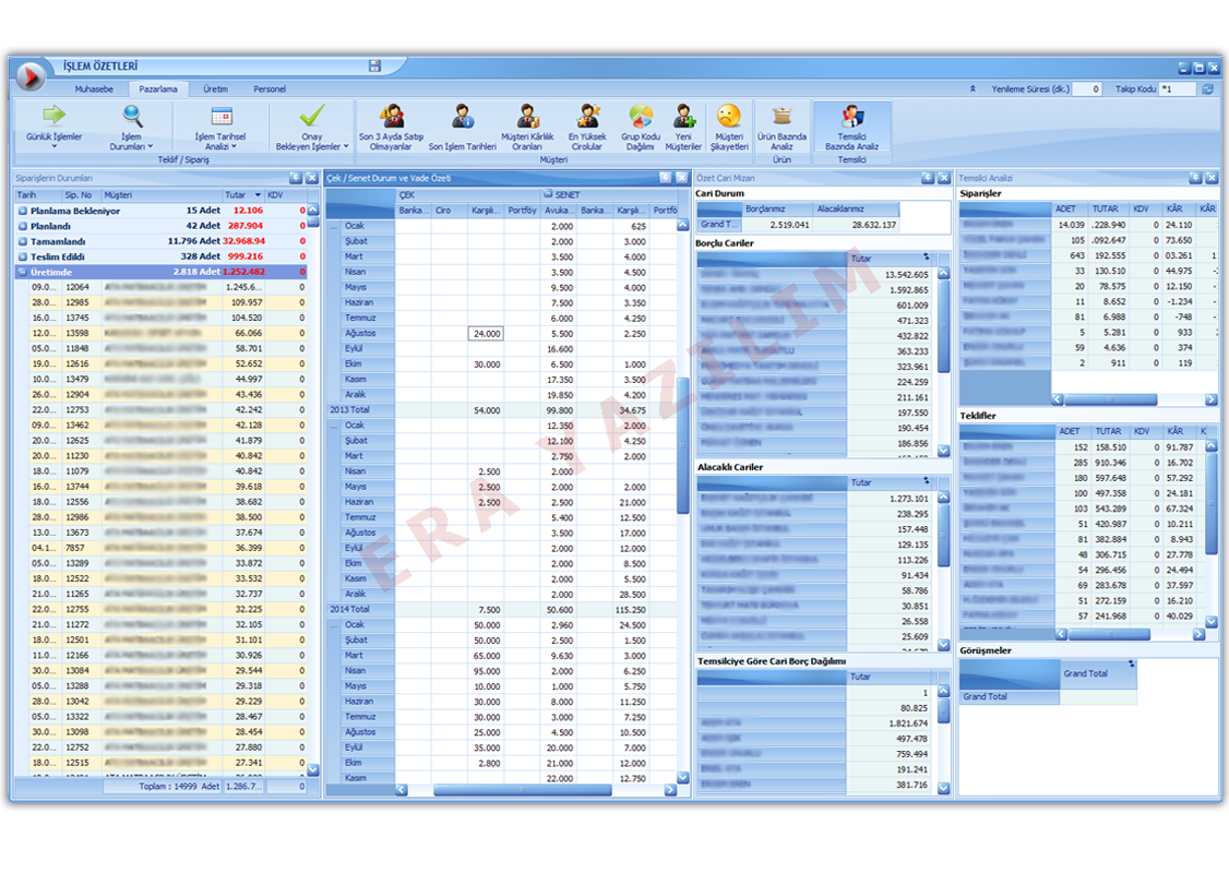 İşlem özetleri ekranında o gün hangi siparişler alınmış, hangi teklifler verilmiş, hangi çekler alınmış ve verilmiş, ne kadar tahsilat yapılmış, banka hesaplarınızın durumu nedir, en çok hangi müşterinin borcu var, üretim hattında hangi siparişler var, termini yaklaşan ve geciken siparişler hangileri gibi pek çok soruya tek tıkla ulaşır, gereksiz detaylarda boğulmazsınız.